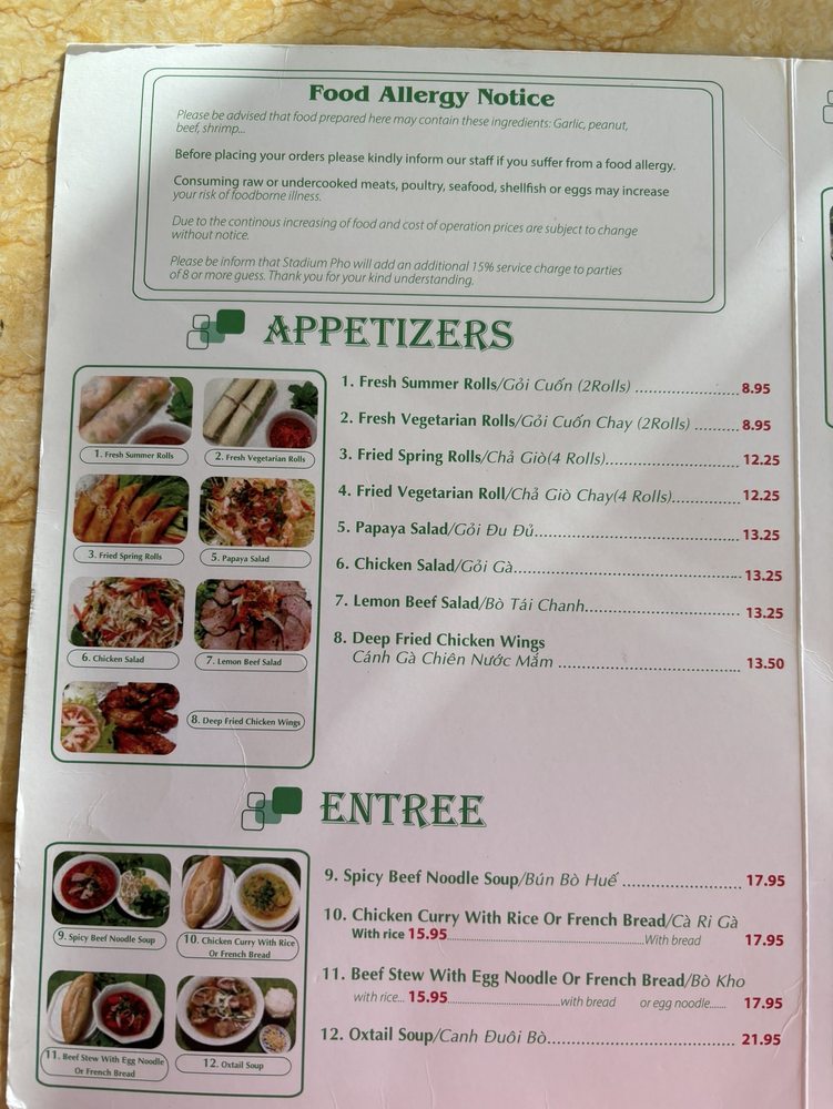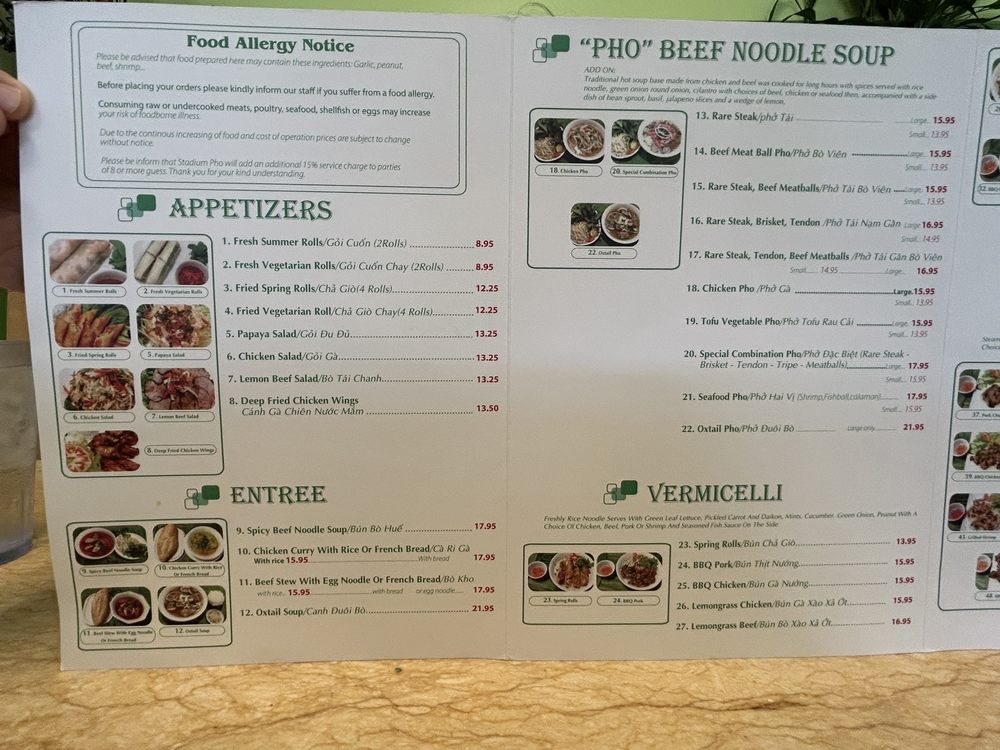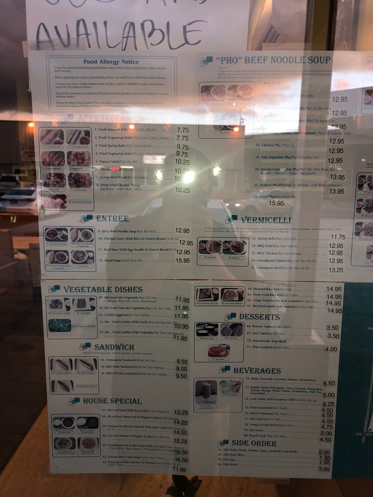 Stadium Pho offers authentic Vietnamese cuisine, known for their flavorful pho and diverse menu options. Located in Honolulu, Stadium Pho provides a casual and welcoming dining experience, with options for delivery and takeout as well. Customers praise the fresh ingredients and generous portion sizes, with popular dishes like the steak and meatball pho and BBQ chicken vermicelli receiving high reviews. The restaurant's clean interior and friendly staff contribute to a positive dining atmosphere. With a focus on customer service and a wide range of menu choices, including appetizers, pho, vermicelli, rice dishes, banh mi, and desserts, Stadium Pho aims to satisfy all tastes. Don't miss out on their homemade lemonade and banana tapioca pudding. Overall, Stadium Pho is a must-visit for Vietnamese food enthusiasts seeking a quality dining experience.